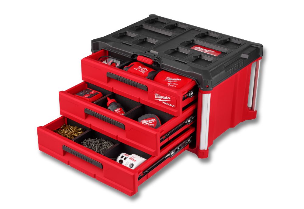 Añade organización profesional a tu sistema PACKOUT con esta caja de 3 cajones: 50?lb de capacidad, cuerpo de polímero robusto, esquinas metálicas reforzadas y barra de seguridad bloqueable para transportar tus herramientas con total confianza.